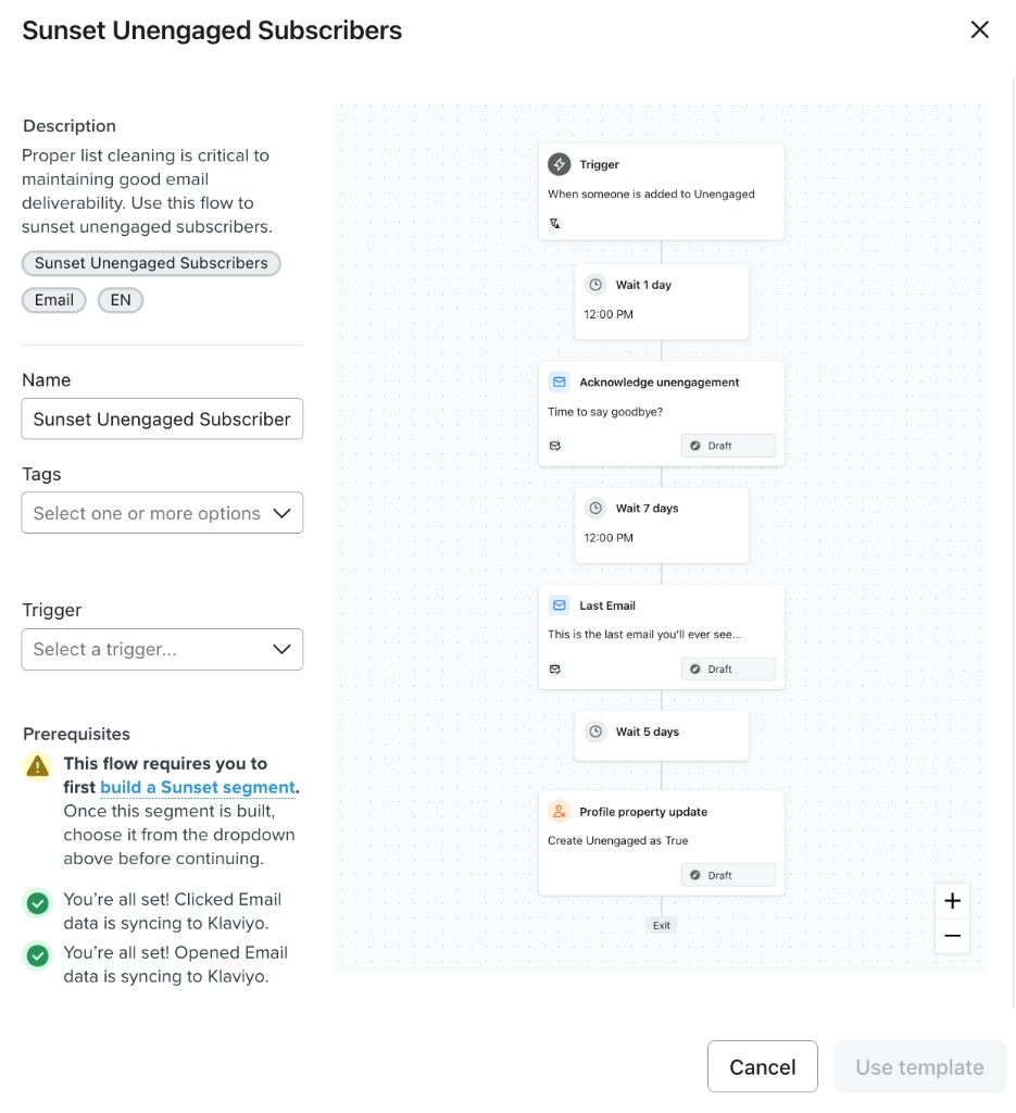 Klaviyo’s “Sunset Unengaged Subscribers”–style templates often end with a profile action such as setting a custom property (for example “Unengaged” = true). That tags the person but does not revoke marketing consent. For deliverability and compliance, you usually want a true unsubscribe from email and SMS marketing — which you can do with a flow Webhook that calls Klaviyo’s Bulk Unsubscribe Profiles API.